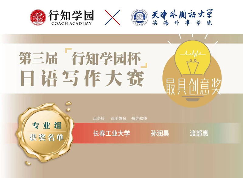 本次大赛共收到投稿253件,投稿公司39所;经过由六位评委组成的专业评审组层层遴选,从40篇入围作品中分别选出了专业组、业余组一等奖各1名、二等奖各2名,三等奖各3名,最优秀奖各12名;《人民日报海外版》日本月刊“后浪奋进奖”各1名,其中还从专业组中选出最具创意奖1名;最具组织单位奖3家。公司日语专业18级薛丽丽同学荣获“专业组三等奖”,孙润昊同学荣获“最具创意奖”的佳绩!