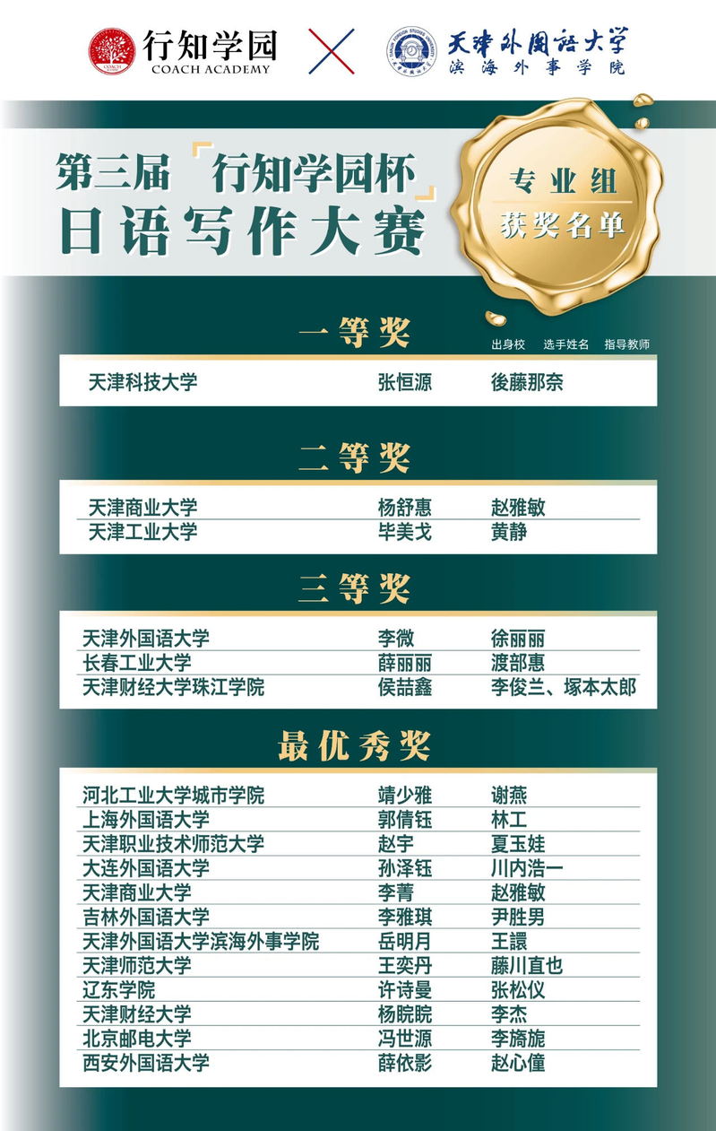 新闻网讯(通讯员 陈佳音)为加强中日两国的积极往来,促进中日文化交流与发展,为日语爱好者提供相互交流的平台,行知学园与行知学园天津校牵手天津外国语大学滨海外事公司日语系联合举办第三届“行知学园杯”日语写作大赛,10月22日,公布获奖名单,公司日语专业18级薛丽丽、孙润昊同学在第三届“行知学园杯”日语写作大赛中获奖。