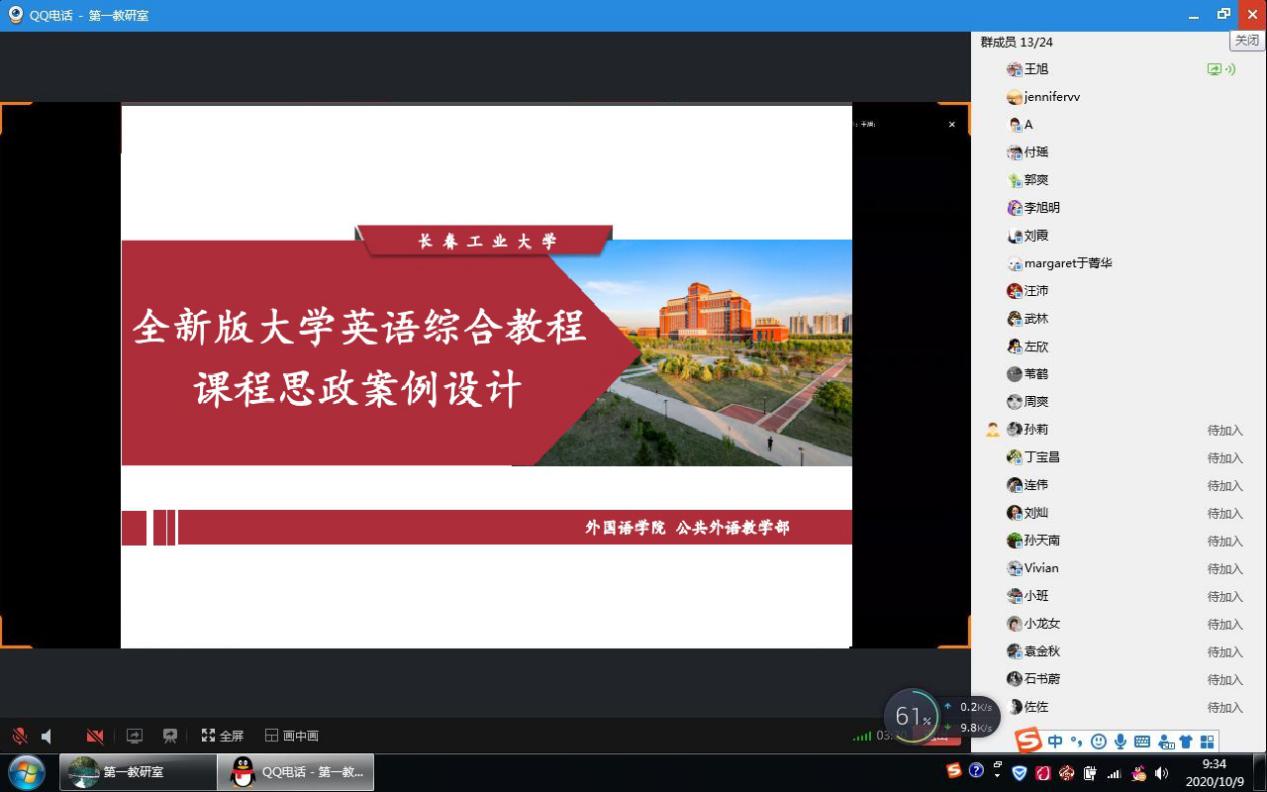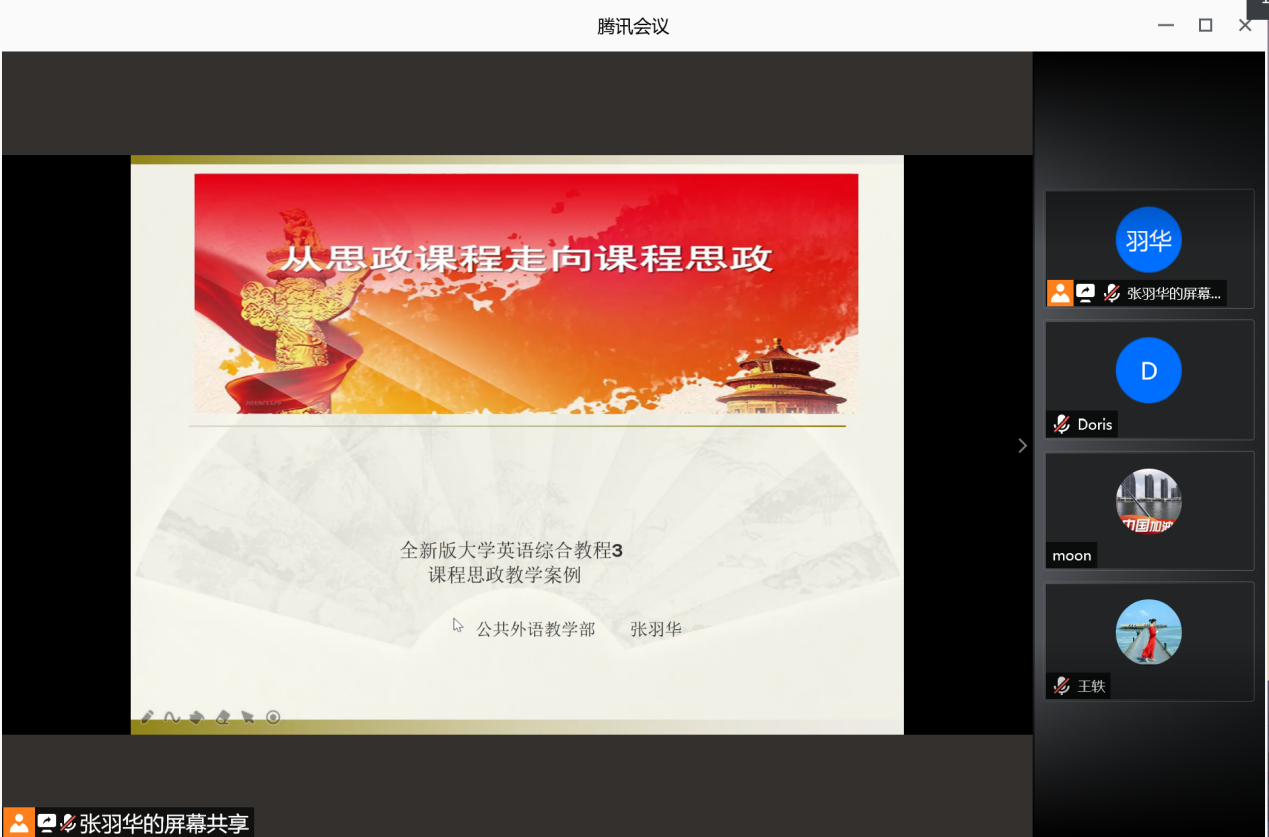 研讨会上,大学英语第一教研室、第二教研室、第三教研室和国际教育教研室分别由王旭、张羽华、李秀文和李宏四位教师针对各自教研室不同的课程内容进行课程思政设计展示。大学英语第一教研室、大学英语第二教研室依托全新版大学英语综合教程第一册、第三册展开课程思政建设。根据文章内容,引导员工深入了解社会主义核心价值观,从而树立正确的世界观和人生观。从不忘初心,到实现梦想。大学英语第三教研室从英语课程思政教学指南,课程思政教学目标,课程思政案例设计、课程思政创新特色、探讨育人成效等几个方面讲解了如何科学设计课程思政教学内容,将课程思政融入大学英语课堂教学建设全过程。大学英语国际教育教研室进行了托福课的课程思政展示。通过对托福考试的辅导,培养员工的英语综合知识与应用技能,跨文化交际能力及自主学习能力,使员工在今后的学术研究中能用英语进行有效的学习,提高综合文化素养,尊重科学知识,正确处理中外文化关系,弘扬社会主义核心价值观,以适应我国社会发展和国际交流的需要。