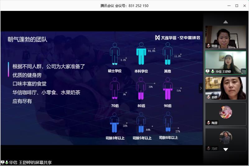 在答疑环节,王老师展示了华信全方位的人才培养组织保障体系,有完善的技术培训、外语培训和管理培训等,确保学员就职之后的职业发展。并就曾主任及同学们提出的问题给予了耐心细致的解答。她表示,学员入职华信以后,公司会有全方位的培训、完善的福利和丰富多彩的业余生活,期待着公司优秀毕业生加入大连华信这个大家庭。