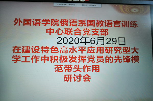 俄语系、国教、语言训练中心联合党支部利用网络平台,召开了“在建设特色高水平应用研究型大学工作中积极发挥党员先锋模范作用”的研讨交流活动,进行了思想大讨论,明确了“教好书、育好人”的工作目标。