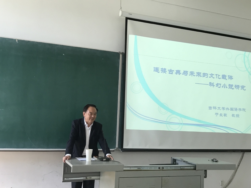 报告会上,于长敏教授以王晋康、吴岩、朝松健等作家的作品为例,谈科幻小说・志怪小说对传统文化的应用。首先,于教授谈到科幻作品内容的丰富源于作家广博的科学知识。接着,具体分析王晋康的长篇小说《古蜀》,吴岩的短篇小说《太空聊斋案》、《老子幽灵车案》等,是如何把过去与未来巧妙地连接在一起的,还有日本作家朝松健的志怪小说也充满传统文化元素。王晋康、吴岩的科幻小说、朝松健的志怪小说,以及神话小说《西游记》等,这些作品的共同之处是把传统文化引入到现代作品中,并且面向未来。因此,提出观点:“既然小说要引用传统,面向未来,文学作品就应成为连接过去和未来的桥梁。而科幻小说应首先担负起这一历史重任,成为把过去和未来连接起来的文化载体”。于教授生动的讲解、精辟的分析和独到的见解赢得了同学们的阵阵掌声,会场氛围热烈。