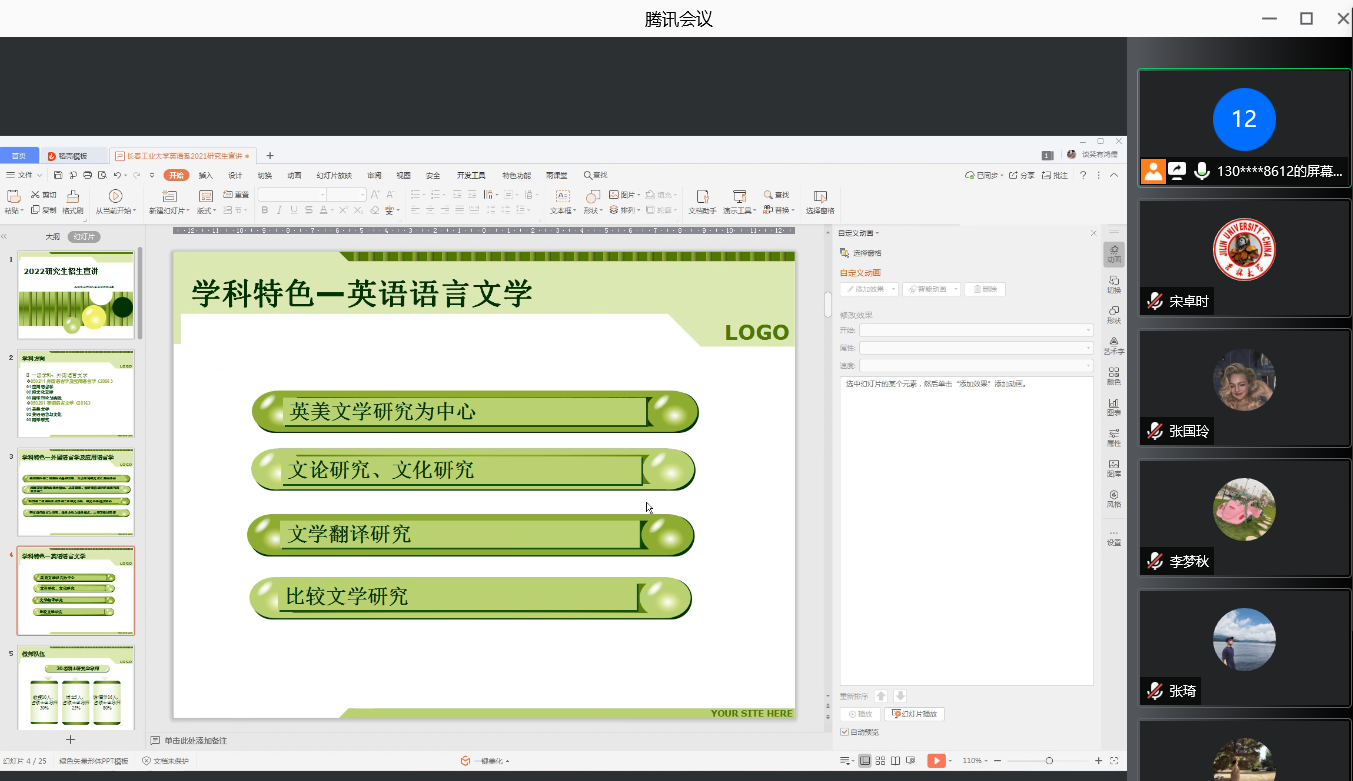 然后,李笑和宋卓时分别从学科特色、教师队伍、优秀毕业生代表、丰富的实践活动、员工就业、考试科目等几个方面详细地介绍了外国语言学及应用语言学、英语语言文学和日语语言文学方向的相关内容。