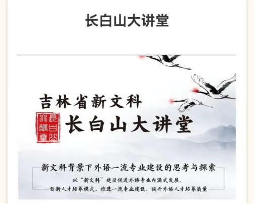 此次“长白山大讲堂”活动,根据我省《全面深化“四新”建设,加快推进本科教育提质创新发展行动计划(2021-2023)》安排,经省教育厅同意,由长春师范大学举办。这是吉林省继2021年12月,第二次为提质外语类新文科团队建设和人才培养,而举办的论坛活动。公司教务处和公司高度重视,认真组织院、系(教研室)负责人、学科专业带头人、专任教师,共81人参加(观看)了“长白山大讲堂”外国语言文学类的系列讲座。