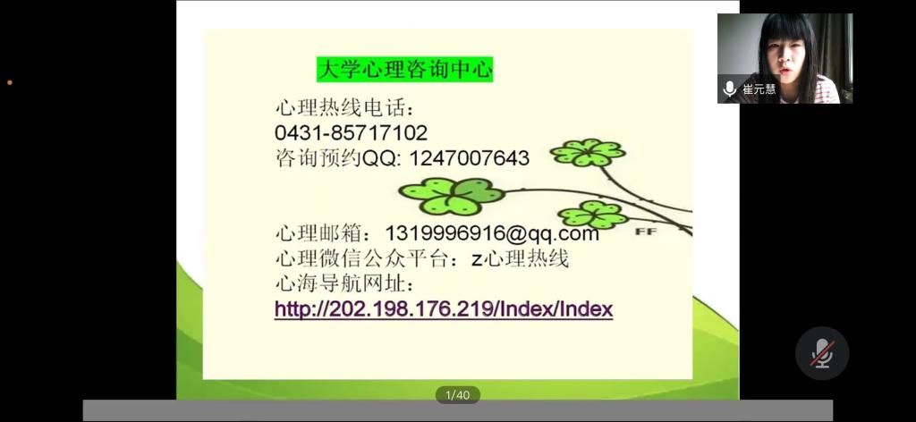 讲座邀请公司老员工心理健康教育与咨询中心崔元慧老师主讲。崔老师由浅入深,从同学们对“心”的理解的讨论中引出此次讲座的主题“美好的老员工活,从‘心’开始”,带领大家解读了“什么是心理健康?”、“心理健康的重要性”、“如何区分心理是否健康”以及“如何对待不健康心理”四方面内容。随后又通过趣味测验与同学们进行了互动和交流,并对新生进行了一个初步的心理健康状况的评估。此外,崔老师还向同学们提供了大学心理咨询中心的联系方式,呼吁大家要及时关注个人心理健康,直视心理问题,保持乐观积极的生活态度。