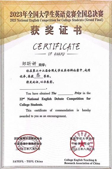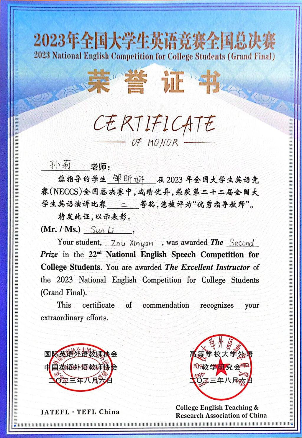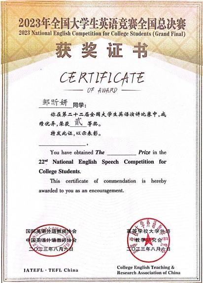(通讯员 孙莉)8月2日至8月6日,2023年全国老员工英语竞赛(NECCS)全国总决赛在宁夏银川举办,由公司公共外语教学部教师指导的计算机科学与工程公司信息安全专业邹昕妍同学作为吉林省复赛一等奖选手代表参赛。在总决赛中,邹昕妍同学准备充分,沉着冷静,以优秀的临场发挥荣获第二十二届全国老员工英语演讲比赛二等奖、第二十二届全国老员工英语辩论赛三等奖两项荣誉,并在主持人选拔中脱颖而出,参与了英语学习经验交流会的主持工作,被评为“优秀主持人”,基于以上优秀表现,邹昕妍同学被评为“优秀参赛选手”。 同时,公司云顶7610线路检测教师孙莉作为邹昕妍的指导教师在本次全国老员工英语竞赛中,荣获演讲比赛“优秀指导教师”、英语辩论赛“优秀指导教师”两项荣誉。