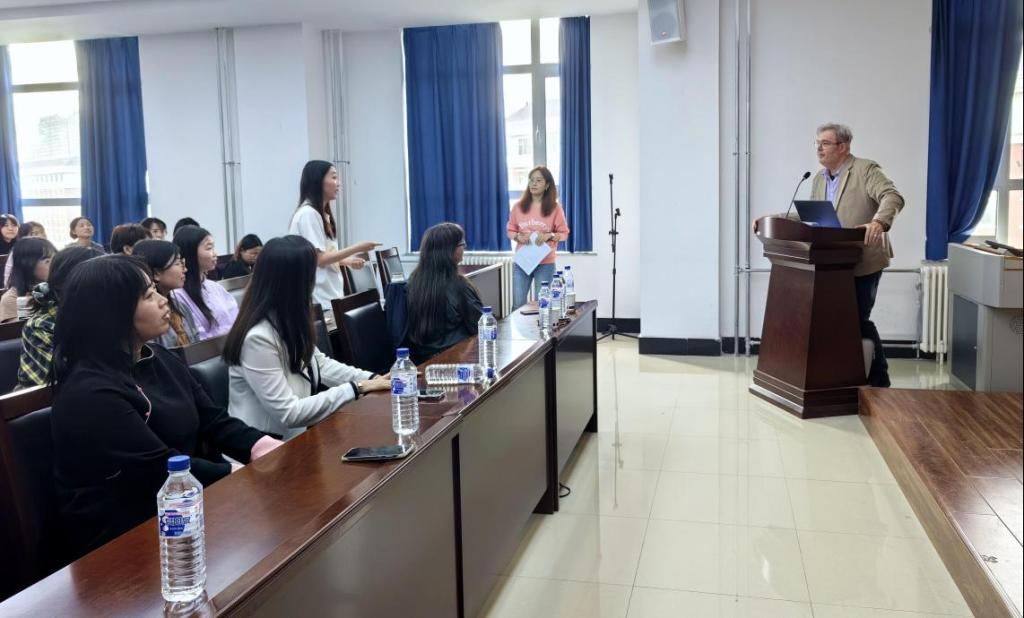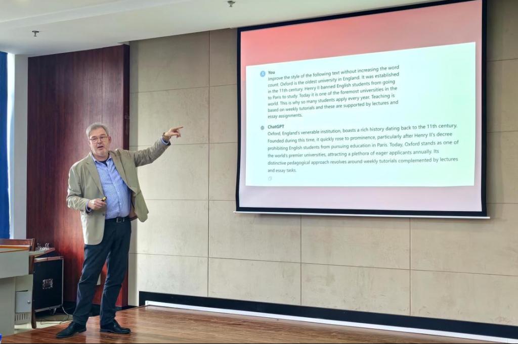 Thomas Jansen,汉学博士,现为英国威尔士三一圣大卫大学汉学副教授,人文学科研究总监,博士研究生导师。Thomas Jansen教授探讨了ChatGPT等人工智能的应用在宏观上对大学教育领域,尤其是现代外语带来的一系列挑战和冲击。Thomas Jansen教授认为,一方面,人工智能的应用需要我们更加努力,提升自身竞争力;另一方面,人工智能可以成为研究工具,为我们提供新的机会。最后,Thomas Jansen教授与同学们进行了热烈的讨论和友好的互动。