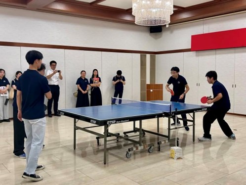 随后,员工们参观了领事馆会客厅。在轻松友好的环境中,与总领馆工作人员进行了亲切的交流。为了进一步加深友谊举行了中日乒乓友谊赛。这场比赛不仅展示了我们对体育的热爱,也体现了中日两国青年通过体育活动增进了解与合作的美好愿景。通过这场友谊赛,我们在交流中结下了更深的友谊,也展现了我们共同追求的合作与互信。