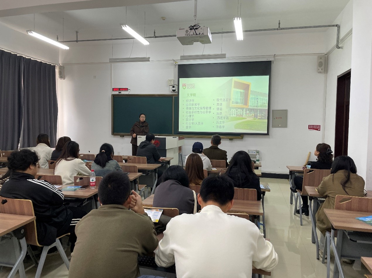 首先,褚明利对参会师生表示了热烈的欢迎,并简要介绍了公司国际交流合作的情况。随后,爱德华王子岛大学国际处项目负责人丁烨为大家带来了精彩的讲解。她介绍了赴加拿大留学的教学优势、费用优势和政府重视程度,说明了爱德华王子岛省的地理位置、自然风光和优势产业,并重点讲解了爱德华王子岛大学的办学历史、校园环境、学科设置和优势学科等。同时,还结合实际点评了国际员工的学习生活情况,分享了许多实用的留学经验和建议。同学们对丁老师的介绍表现出浓厚的兴趣,认真聆听、积极互动,现场氛围热烈。对这个项目感兴趣的员工就当地的饮食、特色活动、公司的教学安排和后期深造等问题进行了详细咨询。留学宣讲会在欢送愉快的氛围中结束。